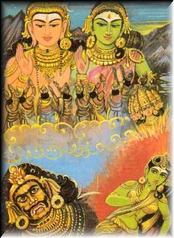 Once in the Himālayas, Parvati prayed to Lord Siva to help her to take a new birth so that tha name of Dakshayani, daughter of Daksha, would be removed. As per her request the Lord ordered her to become a child of Kamavan, the King of the Hills. Parvati became the child of Kamavan and at the age of five she started praying to Lord Siva. Surapadman the asura was ruling the three worlds and was troubling the devas and torturing them. The devas went to Lord Siva and requested him to help them. Siva promised them that he would make an end to Surapadma's life by creating a son of his own. Siva took six faces on his head and created six heads and created six flames from each of his faces. Due to the terrific heat produced from the light the devas all fled. Parvati also could not resist the heat and ran away. Aranar collected all the six sparks and gave them to Vayu the wind god. Vayu gave the sparks to Agni the fire god as he also could not bear the heat. Agni gave them to River Ganga and finally Ganga surrendered the six sparks into Saravana Poikai, a marshy pond in Himalaya. |