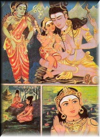 Lord Siva made Murugan to sit on His lap and asked him the meaning of 'OM'. Murugan whispered the meaning to Lord Siva's ear. Thus he became Swami Nathan, the lord of his own father. Visnu's daughters Amirta Valli and Sundara Valli both wanted to marry Lord Murugan and were praying to him at Saravana Poikai. Murugan appeared before them and arranged for Amirta Valli to be born as the daughter of Lord Indra and for Sundara Valli to become the daughter of sage Siva Muni and to be adopted by a hunter chieftain as his step daughter. |