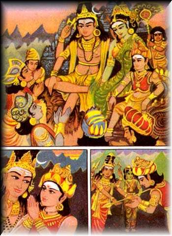When Lord Murugan was with Lord Siva upon Mount Kailasa, Lord Indra together with Lord Visnu and Lord Brahma approached Lord Siva and reported the cruel deeds of the asuras and asked Him to put a stop to it. Siva asked Murugan to go with an army and destroy the asura monsters and thereby put an end to the suffering of the devas. He gave Lord Murugan the power to destroy Surapadma and his brothers and any army of asuras. For this he presented Murugan with a marvelous spear, the Vel. |