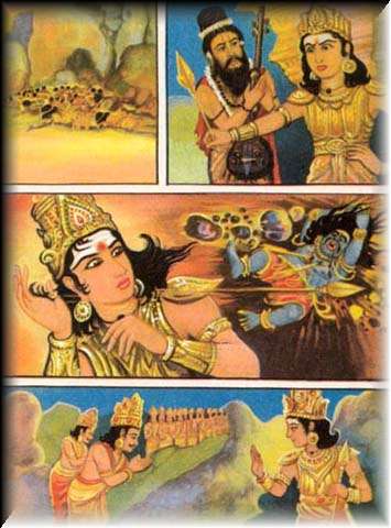 Tārakan saw that his soldiers were being killed in great numbers and became very angry. He used magic to send Veerabahu and his men into the Krauncha mountain and bury them there. Narada carried this message to Lord Murugan. Murugan came and fought with Tarakan. He hurled his Vel, which pierced Tarakan's chest and turned the Krauncha mountain into powder. As soon as the mountain was destroyed, Veerabahu and his men woke up alive. They all sang the praise of Lord Murugan. |