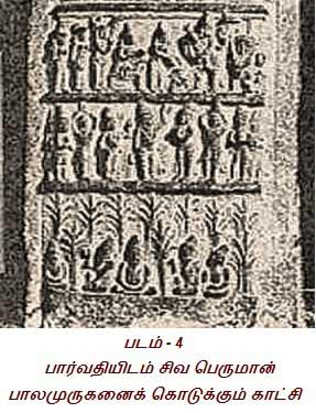 மைலத்தில் உள்ள சிற்பத்தில் கிருத்திகைகள் ஆறு குழந்தைகளாக தாமரையில் இருந்த முருகனை தங்களுடைய கரங்களில் எடுத்துக் கொள்வதைப் போன்ற காட்சி உள்ளது . அடுத்த பகுதியில் ஆறு முகங்களைக் கொண்ட முருகனை தாமரைப் போன்ற நந்திகேசுவரர் சுமந்து வர அதை சிவபெருமானுடன் உள்ள பார்வதி பெற்றுக் கொள்கின்றாள் (படம்-5). அடுத்ததில் பார்வதியும் நந்திகேசுவரரும் சிவனை வணங்கிக் கொண்டு நிற்க சிவன் தன்னுடைய கரத்தில் முருகனை வைத்தபடி நின்று கொண்டு இருக்கின்றார் (படம்-6)