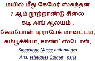 * 7 ஆம் நூற்றாண்டு முதலே ஸ்கந்த கார்த்திகேயா காம்போடியாவில் அறியப்பட்டு உள்ளார். அங்கு வந்த அங்கோரியர்களின் காலத்துக்கு முன்னரே (p. 250, Ref. 3) மயில் மீது அமர்ந்துள்ள நிலையில் உள்ள ஸ்கந்த கார்த்திகேயாவின் சிலைகள் காணப்பட்டன.